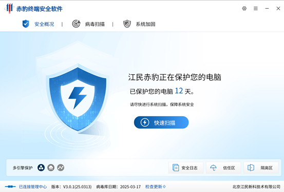 江民网络版杀毒软件,历经三十余载的技术沉淀,拥有卓越的查杀病毒能力,采用下一代扫描引擎、云查杀、云加速、云鉴定、虚拟机、沙盒、慧眼识别、信任对比等技术,以杀毒领域最前沿的技术为用户打造安全放心的使用环境。