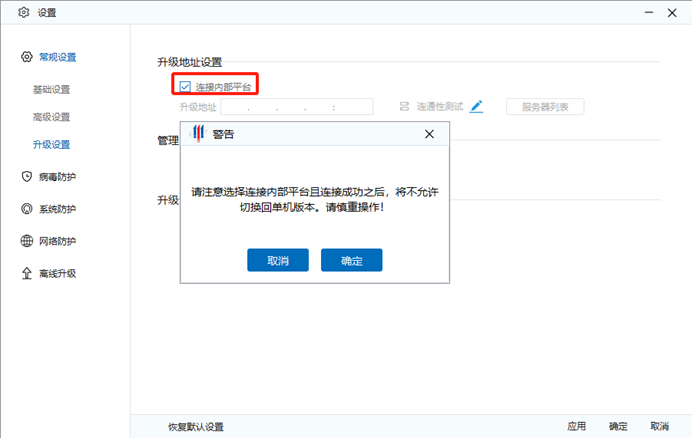 选中连接内部平台,点击确定。注意:选中后将不允许切换回单机版。